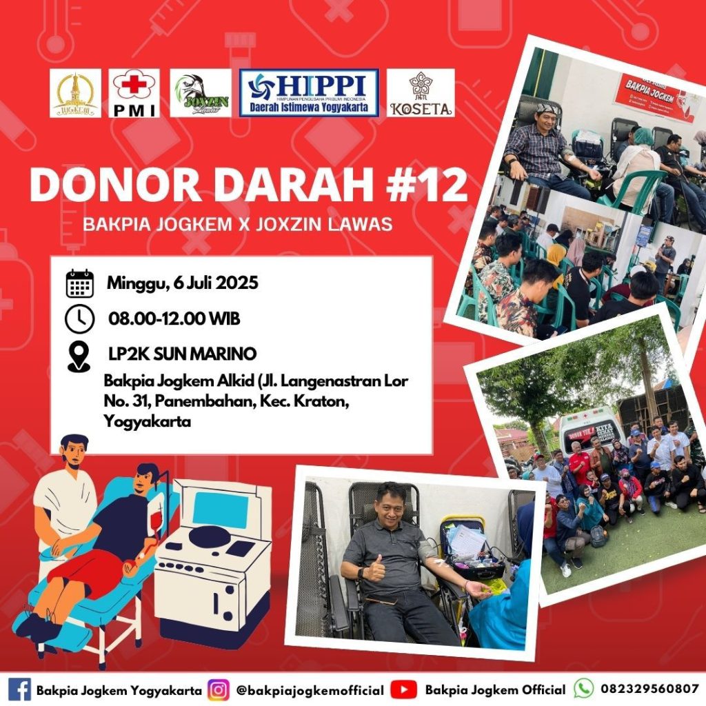 (Hippijogja.com,Yogyakarta) – Dalam semangat kemanusiaan dan kepedulian sosial, Bakpia Jogkem Grup kembali menggelar Aksi Sosial Donor Darah #12 yang akan dilaksanakan pada Minggu pagi, 6 Juli 2025 mendatang, bertempat di LP2K Sun Marino – Bakpia Jogkem Alkid, Jl. Langenastran Lor No. 31, Panembahan, Kraton, Yogyakarta.